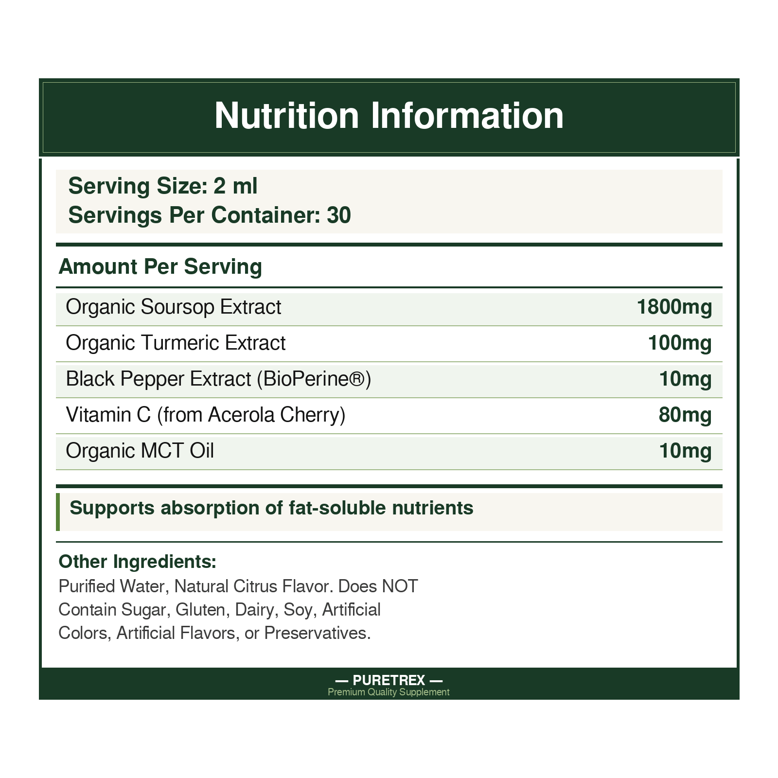 Our liquid soursop drops combine 1800mg organic Annona muricata extract with turmeric, BioPerine®, vitamin C from acerola cherry, and organic MCT oil. Each 2ml serving delivers concentrated botanical compounds in a rapid-absorption liquid format.