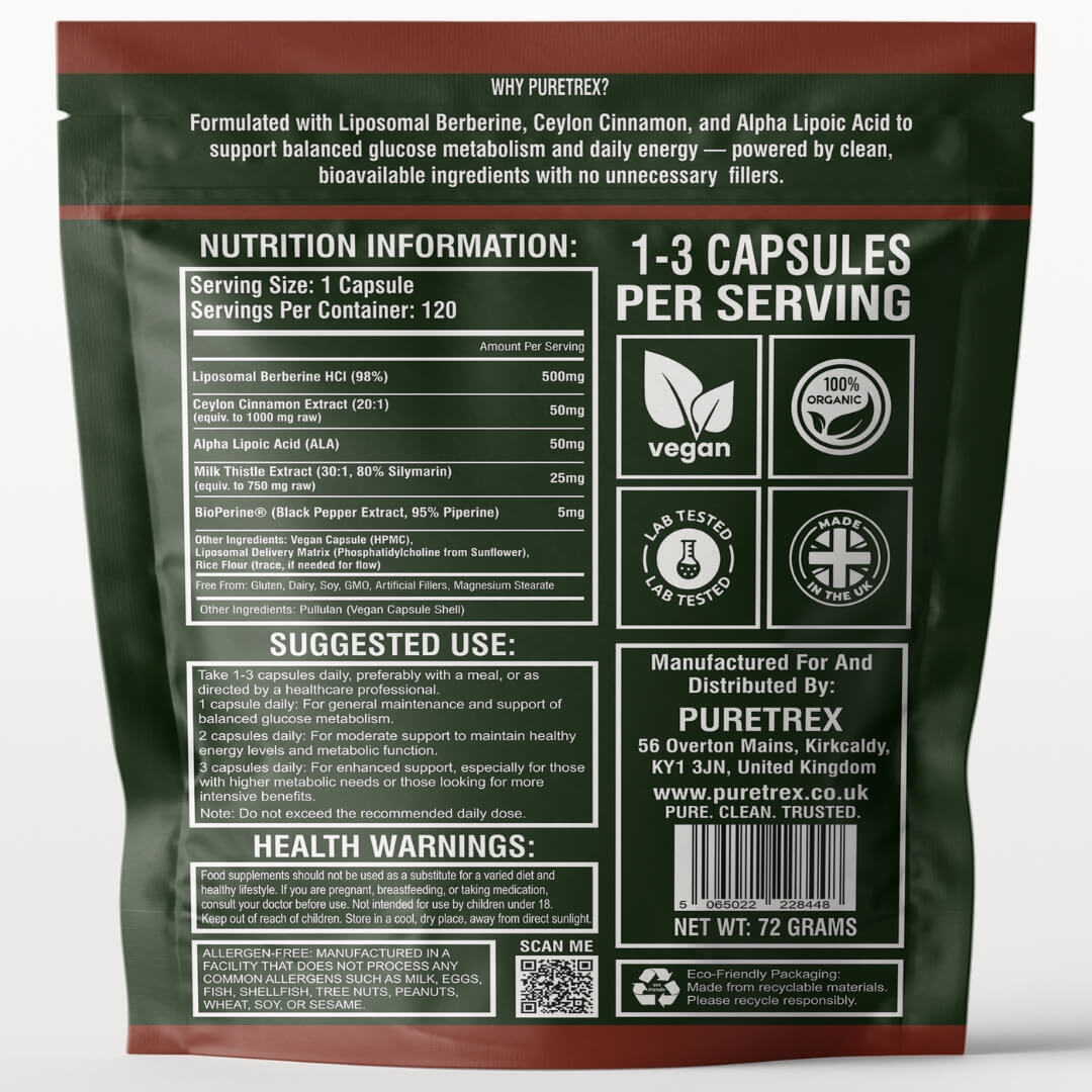 Premium ingredients like Liposomal Berberine HCl, Ceylon Cinnamon, and Alpha Lipoic Acid help balance glucose metabolism, enhance vitality, and promote digestive comfort. Enjoy the power of liposomal delivery, ensuring maximum absorption and effectiveness for your body’s needs.