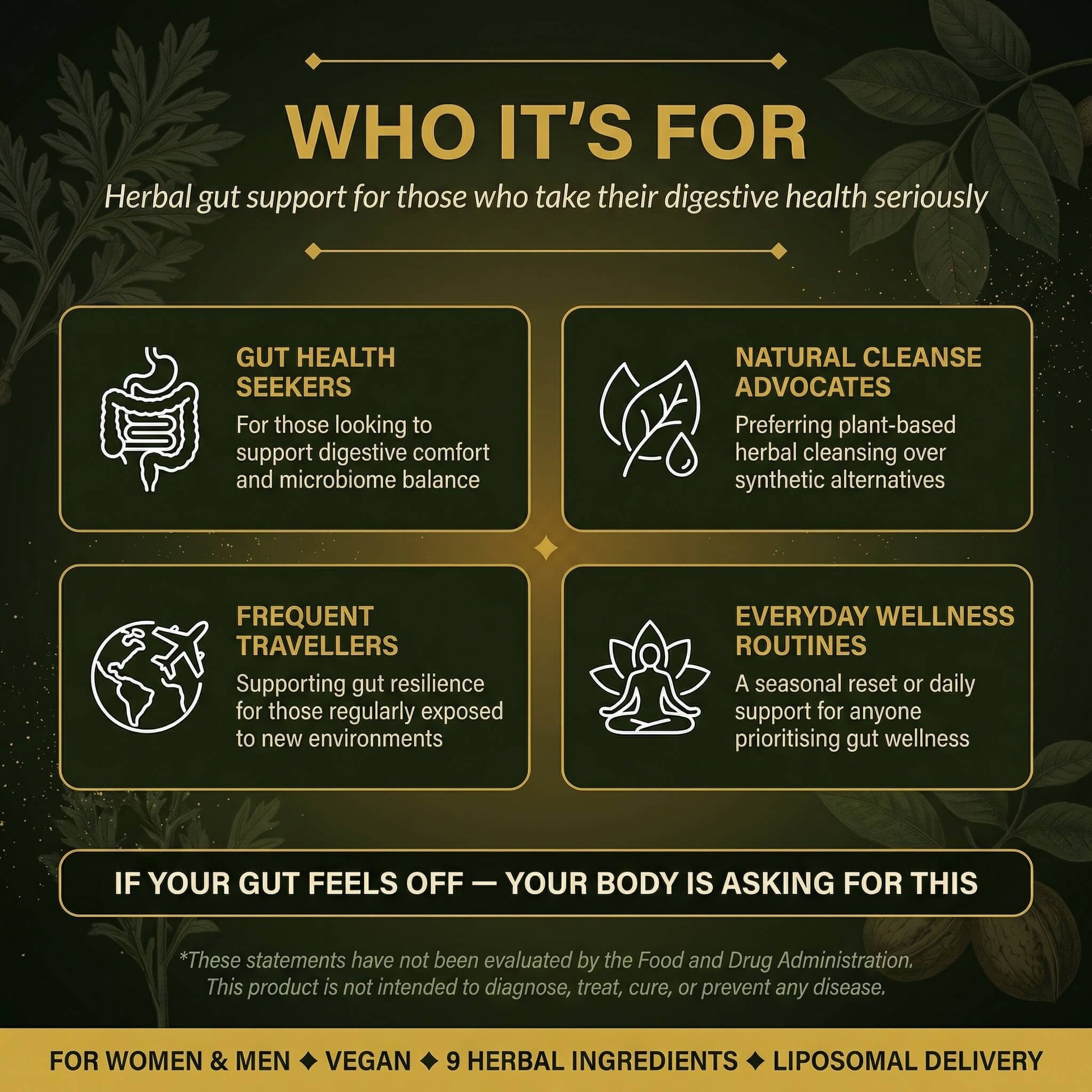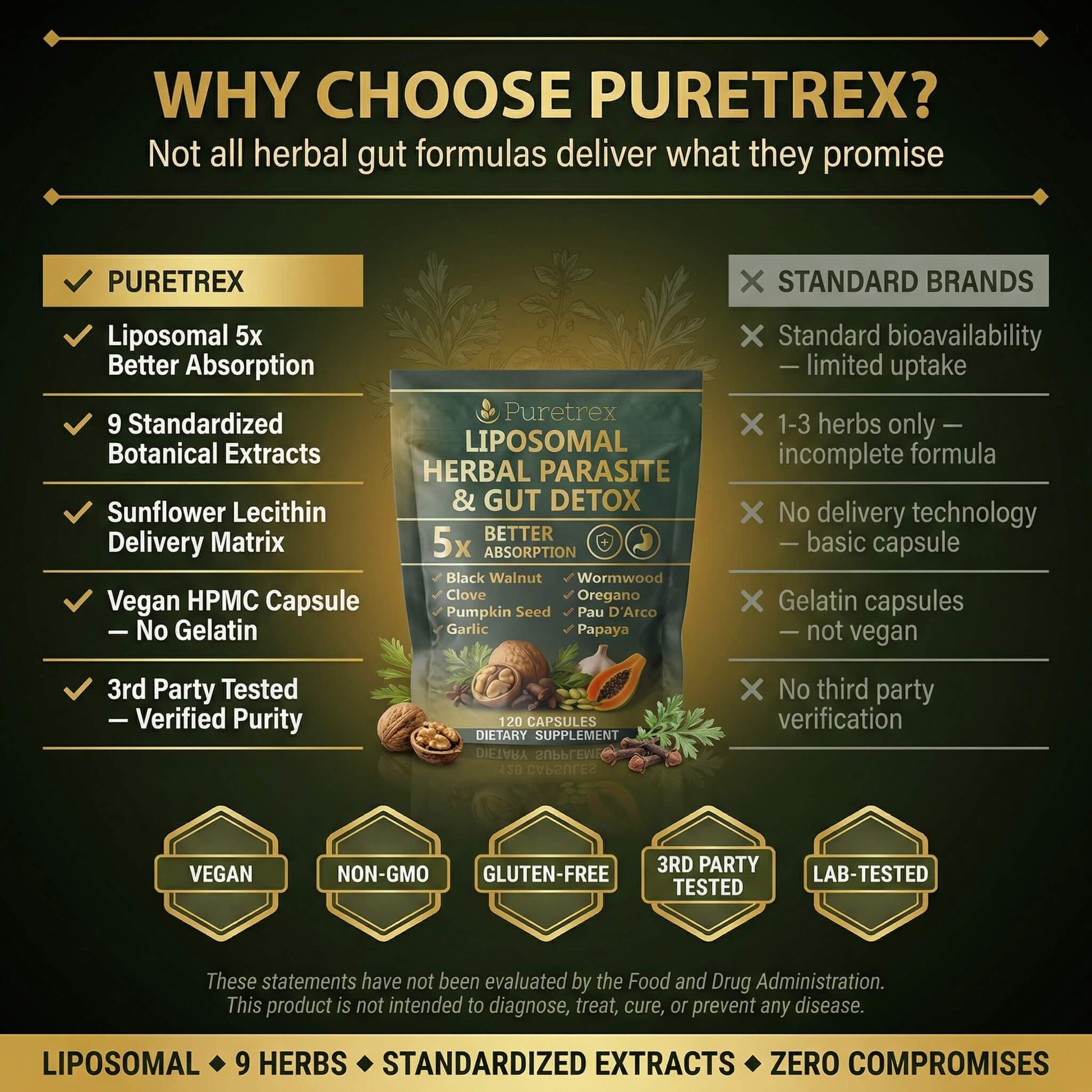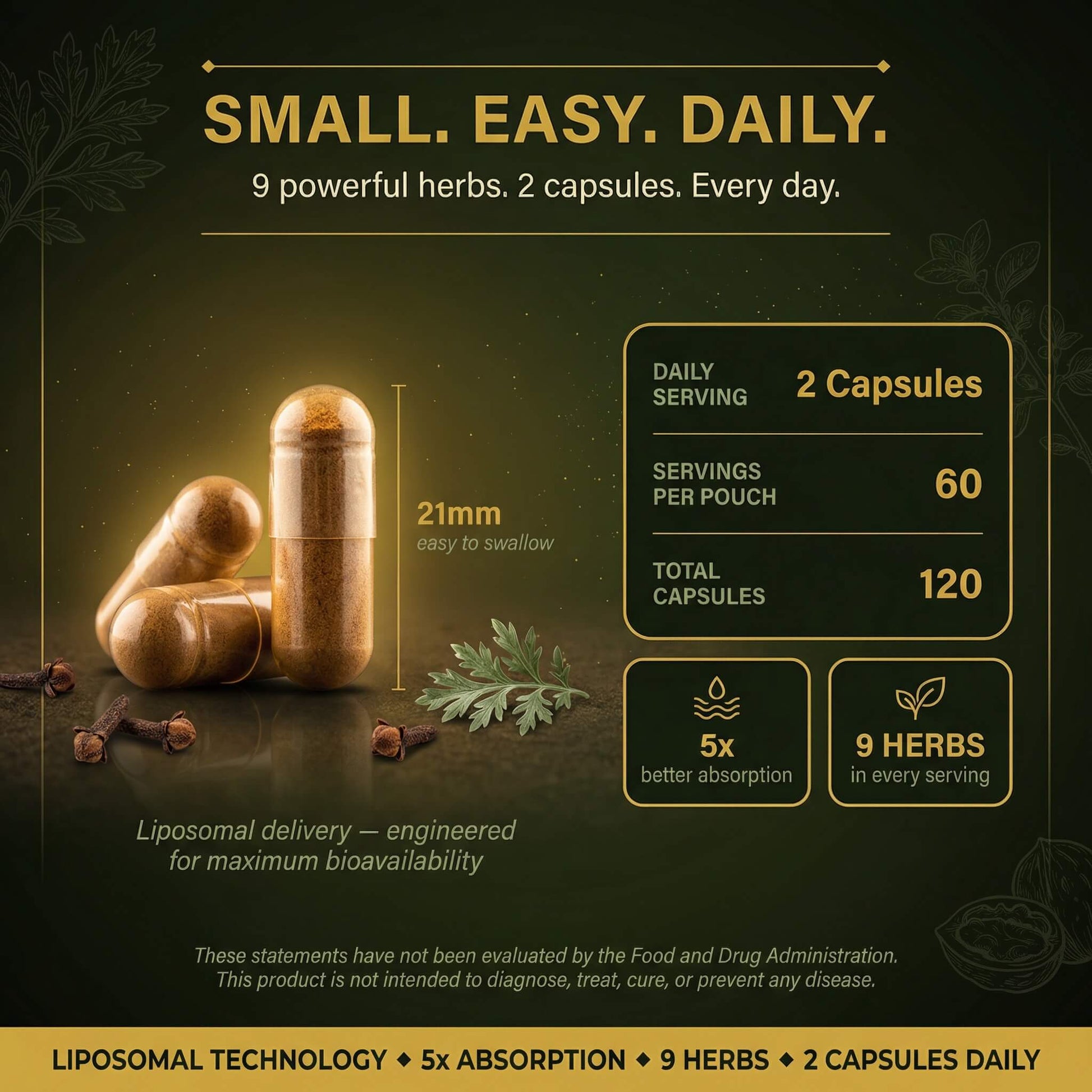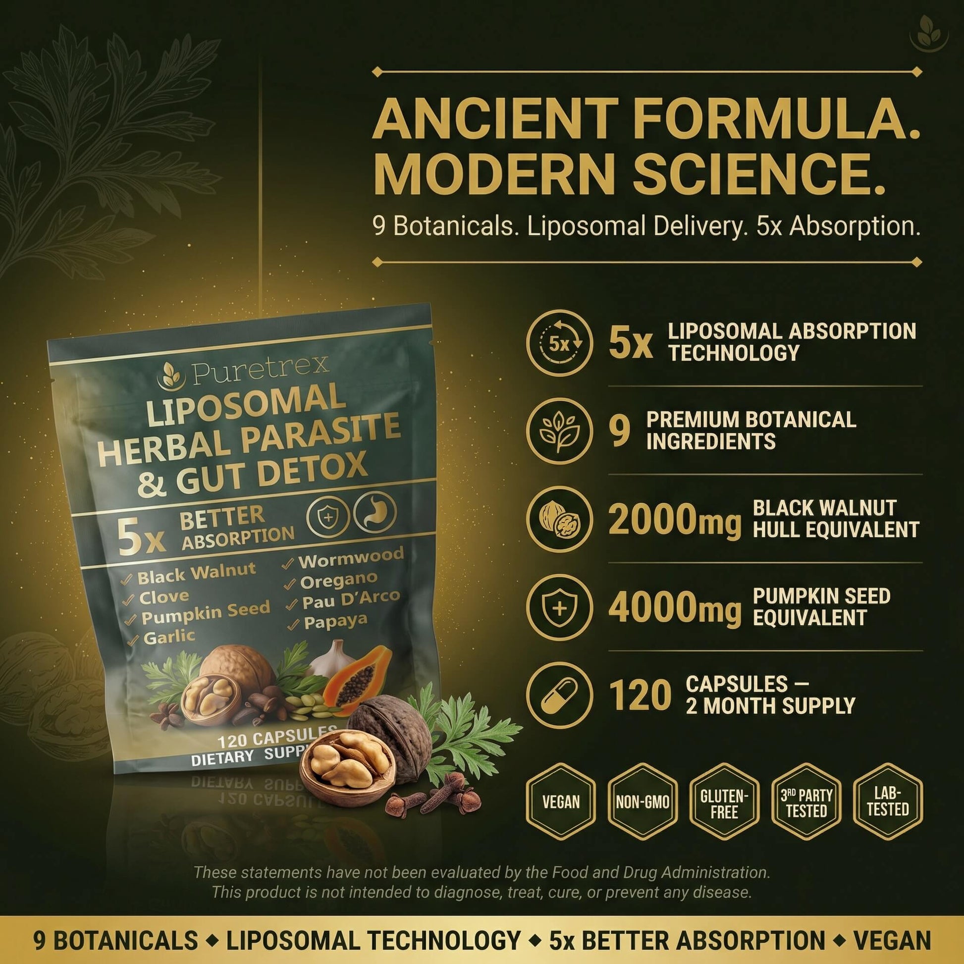 A comprehensive herbal complex combining nine traditional botanicals including Black Walnut Hull (10:1 extract), Wormwood Aerial Parts, and Pumpkin Seed Extract (20:1). Each serving delivers 1,000mg of concentrated herbal extracts in liposomal form.