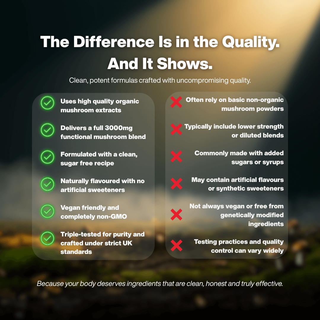 Delivers a clean blend of Lion’s Mane, Reishi, Chaga, and Ashwagandha to naturally support focus, stress balance, and overall vitality.