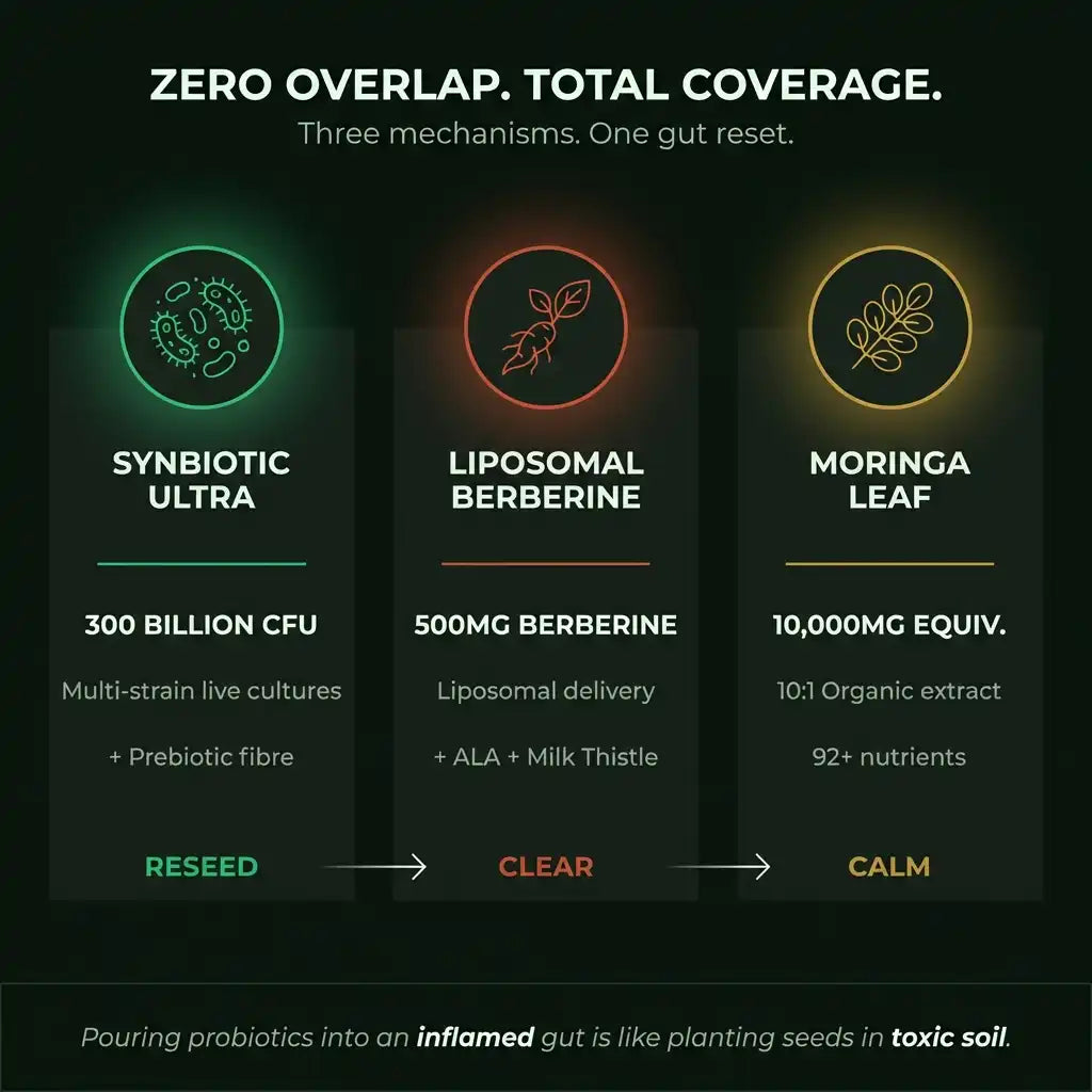 Three precision-formulated supplements, designed to work together as a complete 60-day gut support protocol.