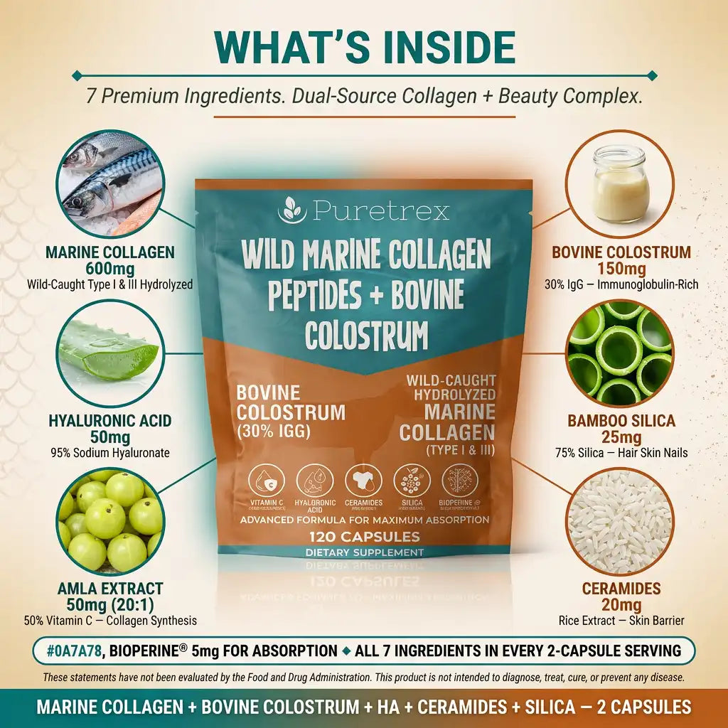 Premium marine collagen peptides combined with IgG-rich bovine colostrum to support joint strength, skin hydration, and gut health.